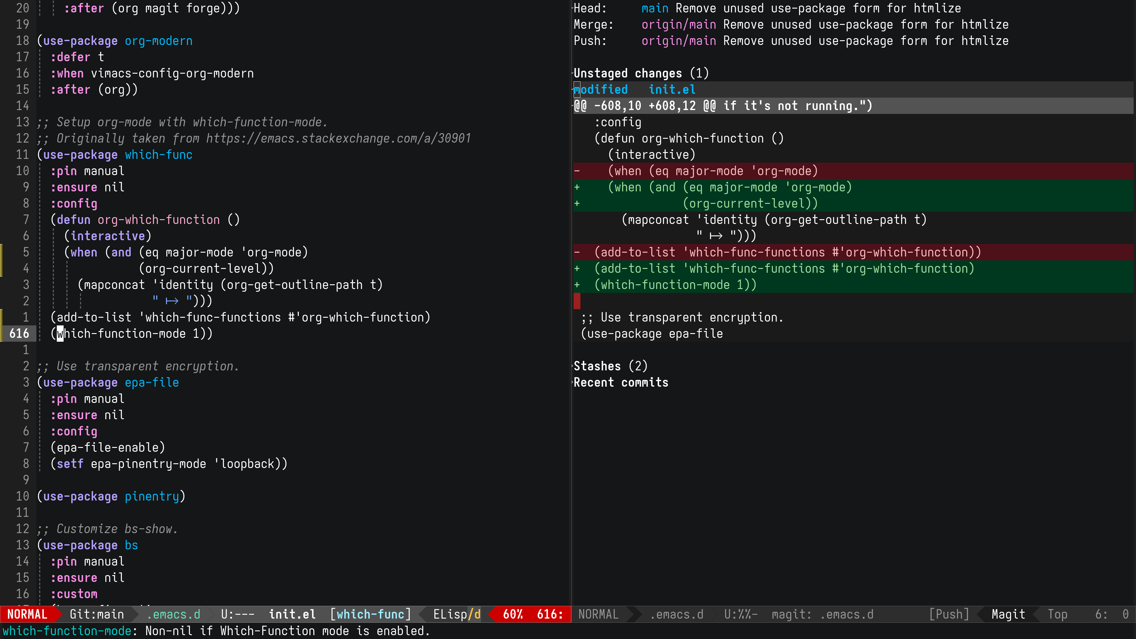 Vimacs.app is an opinionated Emacs config with an IDE-like experience intended for Neovim users seeking a platform with a more integrated mechanism for customization. This config attempts to meld the quick, powerful editing conventions of Vim with the extensibility and power of Emacs while aiming for modern development environment sensibilities like LSP and DAP.